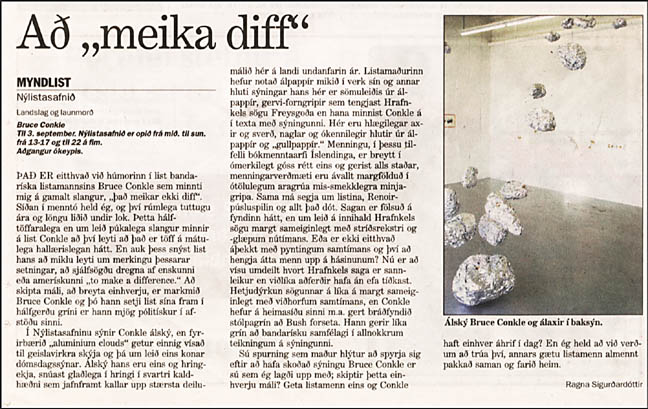 There is something about the humor in the art of the American artist which reminds me of an old slang "it makes no diff " since I was in college, that is approximately twenty years ago and not used any more. This half cool and half not cool slang reminds me of the art of Bruce Conkle in the sense that it is cool in a comfortably not cool way. Besides that his art evolves to a certain extent about the meaning of this sentence, which is of course drawn from english language "to make a difference". To matter, to change something, is the goal of Bruce Conkle and even though he puts his art forward in some kind of a humor he is very political in his position. In the Living Art Museum Bruce Conkle shows aluminum clouds, but the phenomenon aluminum clouds can also point to nuclear clouds and at the same time some kind of doomsday. His aluminum clouds are also like a carousel, they turn cheerfully in circles in black irony which also calls forward the biggest political quarrel here in Iceland in the last few years. The artist has used aluminum foil a lot in his art lately and another part of his exhibition here is also from aluminum foil- fake artifacts which are connected to Hrafnkel's saga Freysgoða but Conkle mentions it in his text accompanying the exhibition. Here are laughable axes and swords, nails and unidentified objects made from aluminum foil and gold foil. Culture, in this instance the literary cultural history of Iceland, is changed into worthless trinkets just like happens everywhere where cultural history is multiplied in uncountable variously tasteless tourist junk. The same can be said about art, Renoir puzzles. The history is faked in a humorous way but at the same time the story of Hrafnkel´s saga has a lot in common with today's warfare and war crimes. Or is there not something similar with modern torture and hanging people up by their Achilles' tendons? It is actually controversial whether Hrafnkel´s saga actually happened but such methods described in the story probably existed anyway. The hero worship of Hrafnkel´s saga also has a lot in common with today's views, also Conkle has in the past for instance made fun of president Bush. He also makes fun of American society in a few drawings in this exhibition. The question that you must ask yourself after seeing Bruce Conkle's exhibition is the one that I began with: Does this matter at all? Can artists like Conkle have any influence today? I think we have to believe that it makes a difference or all artists could pretty much pack up and go home.
